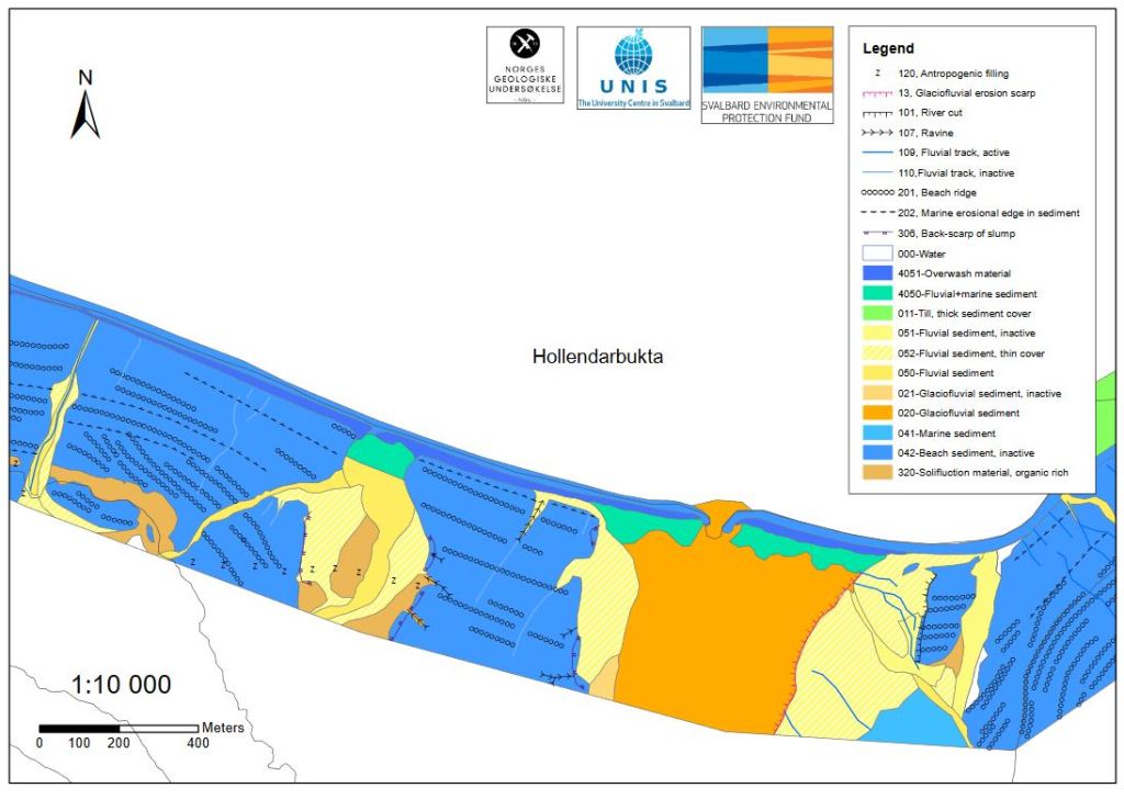Mapping is done in ArcGIS software and is based on a combination of orthorectified aerial photographs from the Norwegian Polar Institute (NP), a 20m resolution Digital Elevation Model, also from NP, and field observations and multiple photos from around the Isfjorden coastline. Digitising was done in approximately 1:3000 scale for the data capturing with the aim of producing a dataset of a quality of 1: 30 000 scale (which was the original outline in the project proposal) or better over the whole area, with a slightly higher precision in the shoreline region. Limitations to aerial photographs and the precision of interpretation and digitising for most areas results in a precision of 3-5 m for single points and 5-15 meters for easily visible borders between sediment types. Where there are gradual sediment transitions and/or difficulties due to aerial photograph quality or in very steep or shadowy areas, the precision and quality can be lower than this. Since the method has been tested and developed during the project, we expect a continued development and quality in future data acquisition relating to the Svalcoast Science Hub maps.