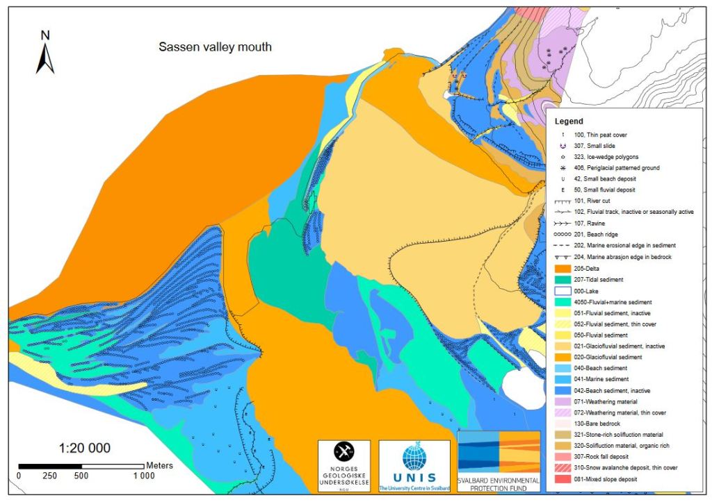 We have followed the Norwegian SOSI classification system for Quaternary geological maps used by NGU (the Geological Survey of Norway) for classification of sediment types, line and point features in surface sediment/Quaternary geology maps. Where necessary, additional codes to capture the variation in Svalbard soft sediments have been developed and used. The standardised classification and visualisation system allow for direct comparison between the DynaCoast geodata and surface sediment maps used in planning and environmental protection on mainland Norway.